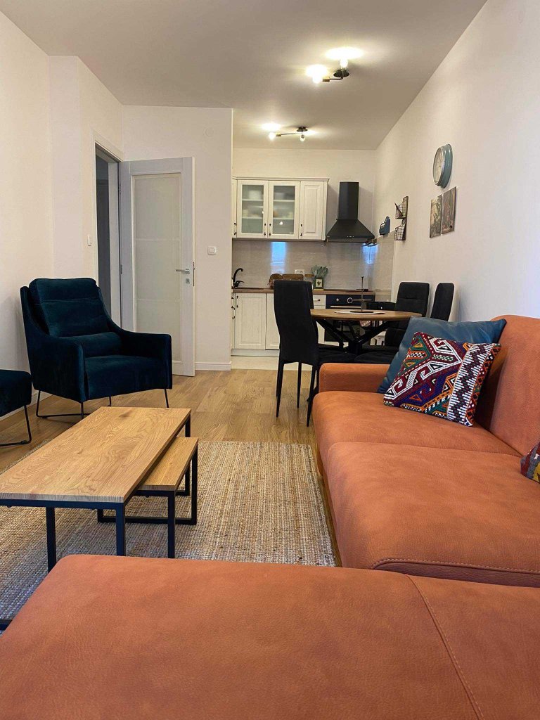 We are renting, for a long time, excellent and completely NEW (no one has lived in this apartment yet) luxuriously equipped, one bedroom apartment in the most attractive location in the city, on the fourth floor (out of 9), in a building (with elevator and garage) - Central Point (first block) in Podgorica.