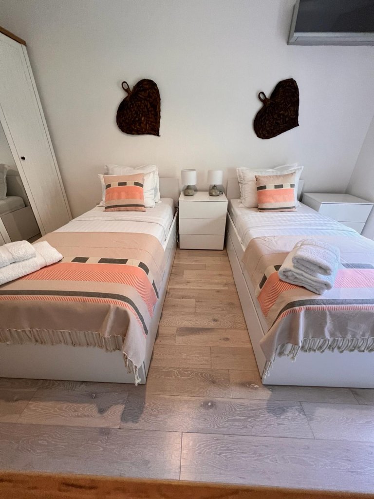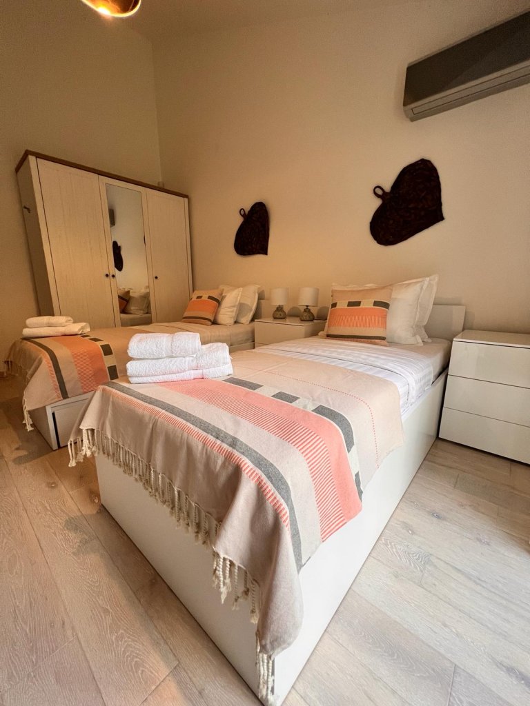 Step inside to find a welcoming hallway leading to a chic bathroom and a separate toilet for added convenience. The two generously-sized bedrooms offer comfort and tranquility, while the well-appointed kitchen is perfect for culinary enthusiasts.